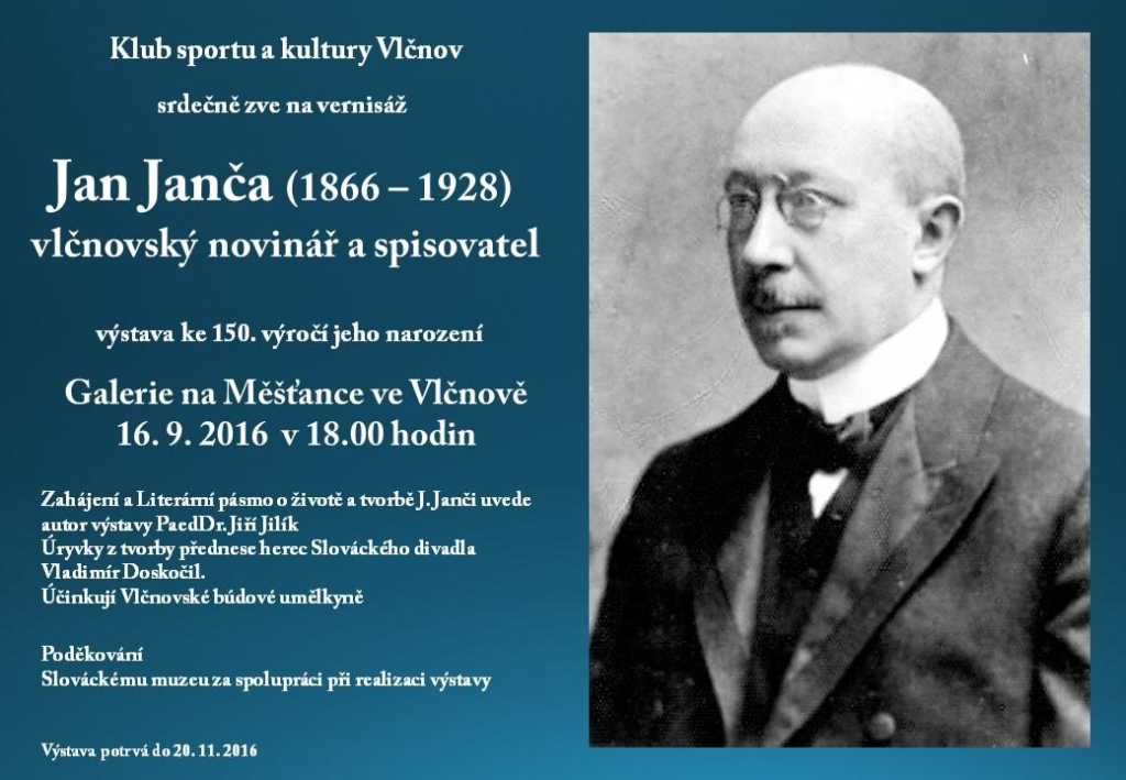 Klub sportu a kultury Vlčnov zve zástupce Syndikátu novinářů ČR na vernisáž výstavy spojenou s literárně komponovaným pásmem, která je věnovaná dříve významnému členu Syndikátu novinářů ČR Janu Jančovi pocházejícímu z obce Vlčnov.