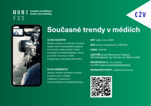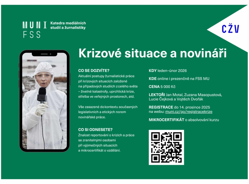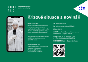 Brno, 18. 11. 2025 – Katedra mediálních studií a žurnalistiky Masarykovy univerzity v lednu 2026 otevírá dva nové kurzy celoživotního vzdělávání. Reaguje tak na výzvy, kterým novináři v současném mediálním prostředí čelí — od etického informování o krizových událostech až po adaptaci na umělou inteligenci a proměňující se chování publika. Kurzy jsou určené jak začínajícím novinářům, tak zkušeným profesionálům, kteří chtějí posílit své kompetence, rozšířit si kontakty a získat tipy na nástroje využitelné v každodenní práci.